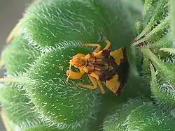 Phymata americana feed on a wide variety of prey, most often including small bees, moths, and flies.[8][9] As their common name suggests, P. americana are sit-and-wait ambush predators, resting on flower heads where they grab visiting insects with large raptorial foreleg weapons.[5][8][9] Females can be larger than males, and often have disproportionately longer weapons.[9] Sexual dimorphism in weapon morphology in P. americana may have evolved due to sex differences in prey capture strategies, with females capturing prey from underneath flower heads and males either eating prey already captured by females or capturing smaller prey on plant stems while searching for mates.[10] Females tend to capture larger prey species than males due to their larger weapons, potentially decreasing intersexual resource competition.[9]