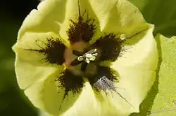 This species is a perennial herb growing 20–60 cm (7.9–23.6 in) tall with somewhat oval-shaped leaf blades 4–7 cm (1.6–2.8 in) long borne on petioles. Flowers occur in the leaf axils. The bell-shaped corolla is up to 2 cm (0.79 in) wide and is yellow with purplish markings around the center. The husk covering the berry is up to 3.5 cm (1.4 in) long with ten veins.[4]