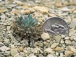 This is a petite perennial herb taking the form of a small, compact mound no more than about 2 centimeters tall. A short stem arises from a hairy caudex that remains buried in the soil. This is attached to a long, slender taproot.[5] The leaves are linear or lance-shaped and measure up to 1.5 centimeters in length. They are coated in hairs, giving them a gray or silver color. The inflorescence is a raceme of flowers. It is so short it generally lies within the densely packed leaves. The flowers have bright yellow petals each about half a centimeter long. The fruit is a silique about the same length.[4] The flowers are pollinated by the bee Andrena hicksii and other Andrena species.[6]