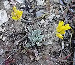 Physaria kingii is a species of flowering plant in the family Brassicaceae known by the common name King bladderpod. It is native to western North America from Utah to Baja California, where it grows in dry and rocky habitat, such as deserts and adjacent mountain slopes. This is a perennial herb growing a small, hairy stem from a caudex. The leaves form a patch or rosette around the caudex, each up to 6 centimeters long and round, oval, diamond, or spoonlike in shape. The inflorescence is an erect or mostly upright raceme of bright yellow mustardlike flowers. The fruit is a hairy capsule under a centimeter long suspended on a short, often curvy pedicel.