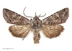 Expanse. 28 to 30 lines. Antennae ferruginous-grey, filiform. Legs, palpi, head, and thorax grey irrorated with ferruginous. A dark mark across front of thoracic crest. Crests strong. Abdomen greyish-ochreous, lighter in colour towards anal tuft, which is light ochreous-grey. Forewings grey, markings ferruginous. Reniform and orbicular grey out-lined with ferruginous. Base of wing light grey, followed by a dark jagged transverse line. A double jagged transverse line at 1⁄4 across wing. A suffused patch around reniform, continuing as a well-defined jagged line with a faint line on each side to dorsum. A rather indistinct suffused line near termen. Cilia grey. Hindwings uniform dark-grey. Cilia silvery-grey with a dark-grey line at base.[2]