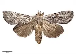 ♂, 31 mm.; ♀, 34 mm. Head and thorax grey, strongly crested. Antennae filiform. Abdomen ochreous grey, crests slight. Forewings bright grey, irrorated with fuscous. A jagged subbasal line, strongly marked on submedian fold, where it turns abruptly towards base. A dark line across wing at 1⁄3, double, space between double lines grey (not irrorated), a dark mark on costa at 1⁄2, followed by two more above reniform. Subterminal line faint and suffused. A terminal series of black points; a few dark points outline veins. Orbicular faint, but with a well-defined line along lower edge. Reniform defined by a dark line below and on terminal edge. Cilia grey, mixed with fuscous. Hind -wings brown, darker towards termen. Cilia brown, with fine paler line at base. Tips grey-white.[3]
