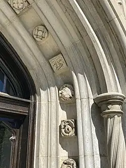 Notable features to the building are intricate details in the masonry, including mascarons and cartouches throughout the door and window areas. These are noticeable as carved faces, characters and natural items like leaves and berries.[9] There are a total of 138 carvings around the building.[10]
