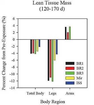 Decreases in skeletal muscle size and function have been reported since humans first began to explore space.[10][28] Spaceflight results in the loss of lean body mass as determined by body composition measurements.[20][29] Urinary amino acid and nitrogen excretion, both indirect measures of catabolism of lean body mass, are elevated during both brief [14] and long [13][30] spaceflights. Direct measurement of protein synthesis during spaceflight using 15N-glycine incorporation as a marker revealed an increase in whole-body protein synthesis rates. These results indicated that the significant decrease in lean body mass observed after spaceflight must be associated with a significant increase in protein degradation rates [14] rather than an inhibition of protein synthesis. Decreases in lower-limb muscle circumference and calculated muscle volumes were detected in Apollo [10] and Spacelab [11] astronauts. Decreases in muscle strength, circumference, and tone have also been reported in cosmonauts.[30][31][32][33] More recently, these findings have been confirmed by direct volume measurements (by magnetic resonance imaging [MRI] of astronauts on the Space Shuttle [21][34] and of Russian cosmonauts and U.S. astronauts after tours of duty on the Mir space station.[20]