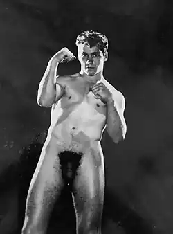 Another early nexus for gay men's involvement in the physique world were bodybuilding competitions. The first of the modern bodybuilding competitions, Mr. America, began in 1939.[4] According to Bob Mizer, it was an "open secret" that gay men comprised a large portion of the audience for these competitions, in which men would display their muscled bodies on stage in skimpy costumes.[5] Gay men also became involved behind-the-scenes in the bodybuilding community, organizing competitions, and working as event photographers.[5]