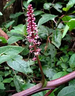Phytolacca sandwicensis has been documented to hybridize with Phytolacca octandra in locations where both species occur.[2][4] Phytolacca octandra was introduced to the Hawaiian Islands (where it was first documented in 1910) from the Neotropics and this species has now been documented on Kauaʻi, Oʻahu, Molokaʻi, Lānaʻi, and Maui.[2] The hybridization between P. sandwicensis and P. octandra can make identification challenging in areas where these two species overlap.[2]