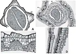 Section of fruit of Bidens, showing phytomelanin deposits (*)