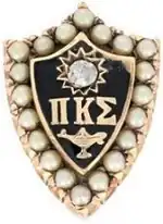 The first badge was a shield design with "thirteen turquoise set in laurel leaves surrounding Pi Kappa Sigma" [2]: 3 At the first convention, a new badge was designed because the newer members claimed that since other sororities had pins symbolizing secrets, so should the Pi Kappa Sigmas.[2]: 419 The second badge was a modified triangular shield of black enamel with the Greek letters ΠΚΣ, a Greek lamp in gold, and a small diamond surrounded by thirteen rays.[4][2]: 420 The pledge pin was a modified triangle in turquoise-blue enamel with the Greek letters ΠΚΣ in gold.[4][2]: 420