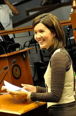 Cayetano authored the Expanded Senior Citizens Act, Expanded Breastfeeding Promoting Act, the Responsible Parenthood and Reproductive Health Act of 2012, and the Philippine Offshore Gaming Operators (POGO) Law, among others.[1] She earned her economics (cum laude) and law degrees at the University of the Philippines, where she played volleyball for the UP Lady Maroons team that won the 1983 UAAP title. She has also played for the national women's volleyball team.[2] Cayetano is also a triathlete. She is currently one of the hosts of the GMA public service program Cayetano in Action with Boy Abunda.