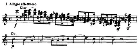 The piece starts with an energetic strike by strings and timpani, followed by a fierce, descending attack by the piano. This exposition chord is followed by a descending, rhythmically incisive chord progression of the solo piano corresponding to the ideal of the boisterous Florestan.