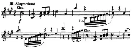 In the coda, a throbbing, mysterious 2/4 rhythm dominates. This is turned into a fierce Davidsbündler-march a little later. The main movement of the concerto ends with four tutti chords.