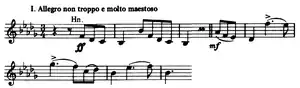 The first movement starts with a short horn theme in B♭ minor, accompanied by orchestral chords that quickly modulate to the lyrical and passionate theme in D♭ major. This subsidiary theme is heard three times, the last of which is preceded by a piano cadenza,[28] and never appears again throughout the movement. The introduction ends in a subdued manner. The exposition proper then begins in the concerto's tonic minor key, with a Ukrainian folk theme based on a melody that Tchaikovsky heard performed by blind lirnyks at a market in Kamianka (near Kyiv). A short transitional passage is a call and response section on the tutti and the piano, alternating between high and low registers. The second subject group consists of two alternating themes, the first of which features some of the melodic contours from the introduction. This is answered by a smoother and more consoling second theme, played by the strings and set in the subtonic key (A♭ major) over a pedal point, before a more turbulent reappearance of the woodwind theme, this time reinforced by driving piano arpeggios, gradually builds to a stormy climax in C minor that ends with a brief cadenza and an authentic cadence on the solo piano. After a short pause, a closing section, based on a variation of the consoling theme, closes the exposition in A♭ major.[29]