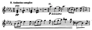 After a brief pizzicato introduction, the flute carries the first statement of the theme. The flute's opening four notes are A♭–E♭–F–A♭, while each other statement of this motif in the remainder of the movement substitutes the F for a (higher) B♭. The British pianist Stephen Hough suggests this may be an error in the published score, and that the flute should play a B♭.[37] After the flute's opening statement of the melody, the piano continues and modulates to F major. After a bridge section, two cellos return with the theme in D♭ major and the oboe continues it. The A section ends with the piano holding a high F major chord, pianissimo. The movement's B section is in D minor (the relative minor of F major) and marked "allegro vivace assai" or "prestissimo", depending on the edition. It commences with a virtuosic piano introduction before the piano assumes an accompanying role and the strings commence a new melody in D major. The B section ends with another virtuosic solo piano passage, leading into the return of the A section. In the return, the piano makes the first, now ornamented, statement of the theme. The oboe continues the theme, this time resolving it to the tonic (D♭ major) and setting up a brief coda which finishes ppp on another plagal cadence.