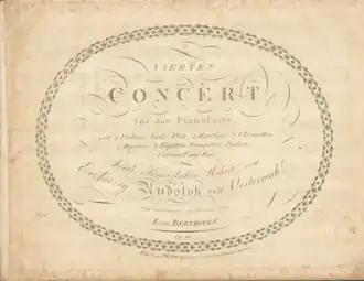 It was premiered in March 1807 at a private concert of the home of Prince Franz Joseph von Lobkowitz. The Coriolan Overture and the Fourth Symphony were premiered in that same concert.[1] However, the public premiere was not until a concert on 22 December 1808 at Vienna's Theater an der Wien. Beethoven again took the stage as soloist. The marathon concert saw Beethoven's last appearance as a soloist with orchestra, as well as the premieres of the Choral Fantasy and the Fifth and Sixth symphonies. Beethoven dedicated the concerto to his friend, student, and patron, the Archduke Rudolph.