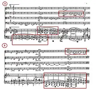 This coup may have been inspired by a similar confluence of themes in Mendelssohn's E♭ quartet op. 12.[12] It also, probably deliberately, evokes the climactic contrapuntal finales of works such as Mozart's Jupiter Symphony. The movement as a whole can be noted for the rondo-like reappearances of the opening theme A1, which consistently avoids the tonic key until the final fugato; for its innovative key scheme, which combines the restless modulations of a traditional sonata development with the idea of recapitulation in the tonic; and for its successful integration of counterpoint within a non-contrapuntal formal structure.