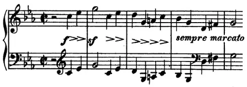The movement's energetic main theme opens in minims, and characterized by wide, upward-leaping intervals. Tovey writes of the theme that its use of upward leaps is so striking that "it is impossible for the violoncello to throw in a casual leap of an octave in minims without implying the first theme".[10] The contrasting second theme, marked dolce, is reached after a transitional section marked by glances at remoter flat keys. It is presented as a duet between cello and viola, and its "meltingly romantic"[5] character is typical of Schumann's ardent inspiration in this quintet.