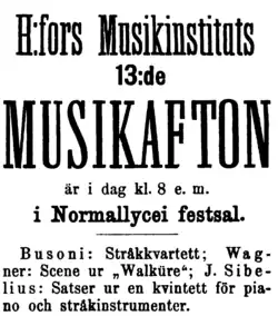 Movements I and III of the Piano Quintet premiered in Helsinki on 5 May 1890 at the Music Institute (now the Sibelius Academy); the performers included the Norwegian composer Johan Halvorsen (violin) and the Italian composer Ferruccio Busoni (piano), as well as Karl Wasenius (violin), Josef Schwartz (viola), and Otto Hutschenreuter (cello).[1] Movements II and IV had their premieres a half-year later on 11 October the first four movements were performed in Turku; among the soloists was Sibelius's close friend, the playwright Adolf Paul, who played piano, as well as Richard Hagel on first violin.[1]