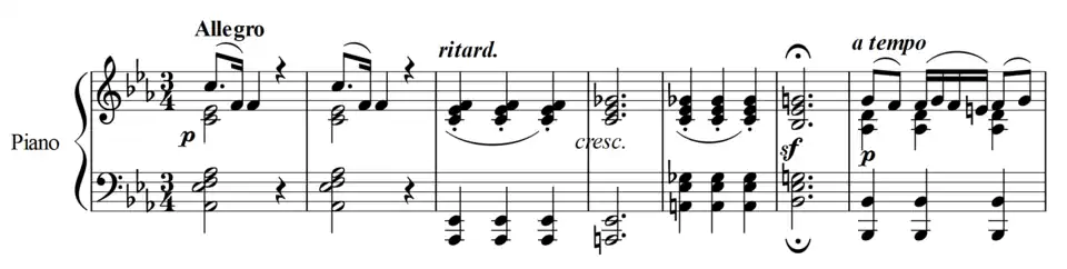 Beethoven's progressive harmonic language is apparent from the very first chord of the piece (third inversion of the eleventh on dominant B♭[3]); the stability of a tonic chord in root position is delayed until bar 8. The expressive harmonic colour coupled with the changes of tempi in the introduction (mm. 1–18) create an evocative opening, reminiscent of the improvisatory style of C. P. E. Bach's piano sonatas. This opening cell is repeated extensively throughout the movement – at the start of the development (m. 89), in the recapitulation (m. 137), and during the coda (transposed into the subdominant A♭ (m. 220), and then at its original pitch (m. 237)). The modulatory passage between the first and second subjects (mm. 33–45) explores the opening chord, but in a minor variation (with a C♭, implying ii7 of E♭ minor), even appearing in bar 36 in the exact spacing (albeit with different spelling) of the Tristan chord written by Richard Wagner some 55 years later.