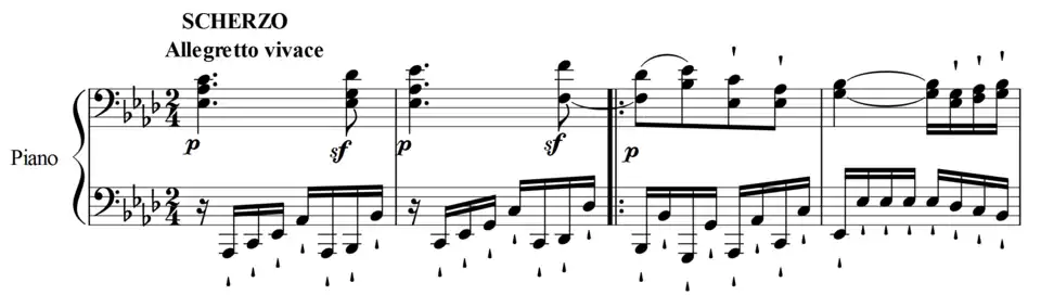 4, and because it is in sonata form rather than ternary form. This wasn't the first time Beethoven wrote a scherzo not in ternary form; Op. 14, No. 2 has a scherzo in rondo form as its finale. But this movement still contains many characteristics of a scherzo, including unexpected pauses and a playful nature. The theme is in the right hand while the left hand contains staccato accompaniment.
