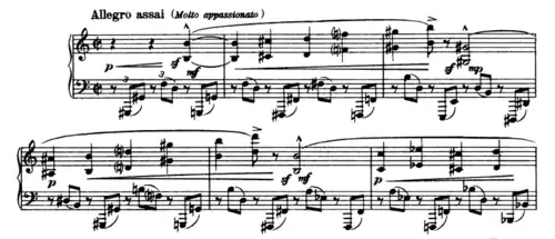 The first movement starts in cut time. It opens with a searching introductory theme, in ascending octaves built around diminished 7ths, which recurs at various times throughout the two movements, accompanied by of broken octaves descending chromatically in tuplets in the left hand. The theme progresses and changes time signatures numerous times until the start of the 2nd thematic group in Quasi andante section marked by new, more lyrical theme.