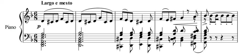 The second movement is a slow movement in sonata form. This movement is in the parallel key of D minor.[2]