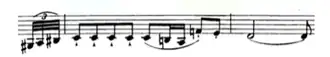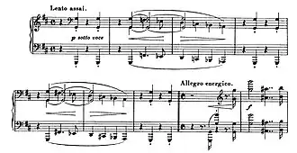 to Alla breve, and the second theme marked Allegro energico, consisting of a jagged, forceful motif in octaves, is introduced.[23] This is quickly followed by the third theme, which Liszt characterize as Hammerschlag ('hammer-blow') to describe the single note repetition in the theme.[24] A dialogue ensues, with mounting energy, until reaching the noble Grandioso material in D major. Liszt transforms the "hammer-blow" motif into a grand melodic gesture masked cantando espressivo.[25] The slow movement, an Andante sostenuto in F-sharp major, is the centerpiece of the Sonata. This fully-fledged movement, in compound ternary form, features, in quick succession, a number of themes heard earlier in the Sonata in a tour de force of thematic economy.[26]