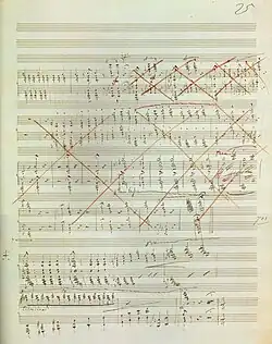 Page 25 of the manuscript. The large section crossed out in red contains the original loud ending.