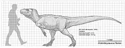 The type species, Piatnitzkysaurus floresi, was described by Jose Bonaparte in 1979.[2] It was named to honor Alejandro Matveievich Piatnitzky (1879–1959), a Russian-born Argentine geologist.[2] In Bonaparte’s 1979 paper on the taxon, he briefly described it along with the sauropods Patagosaurus fariasi (a cetiosaurid)and Volkheimeria chubutensis (an early eusauropod) from the same deposits.[2] It wasn’t until 1986 that Bonaparte fully described the theropod, classifying it in Allosauridae along with Allosaurus, Acrocanthosaurus, Eustreptospondylus, and Dilophosaurus.[3] Piatnitzkysaurus was later reclassified as an abelisaurid,[4] basal carnosaur, basal tetanuran,[5] and non-megalosaurid megalosauroid[6] in phylogenetic analyses, but was classified in its own family in 2012, the Piatnitzkysauridae.[6]