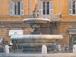 The fountain, built in 1589 by Andrea Brasca, Pietreo Gucci and Pace Naldini on a design by Giacomo Della Porta, one time rose on two steps repeating the lines of the lower basin and was surrounded by a logline receiving the water. In 1800 the steps were removed and replaced by little columns. The fountain has two basins with different shapes; the smaller one sustains a group of putti pouring water from a vase.