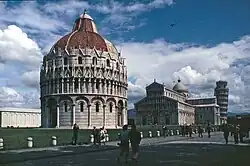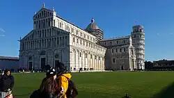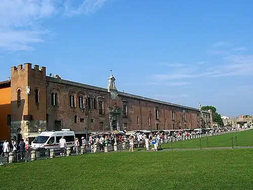 The Piazza dei Miracoli (Italian: [ˈpjattsa dei miˈraːkoli]; 'Square of Miracles'), formally known as Piazza del Duomo ('Cathedral Square'), is a walled 8.87-hectare (21.9-acre) compound in central Pisa, Tuscany, Italy, recognized as an important center of European medieval art and one of the finest architectural complexes in the world.[1] It was all owned by the Catholic Church and is dominated by four great religious edifices: Pisa Cathedral, the Pisa Baptistery, the Leaning Tower of Pisa (the cathedral's campanile or bell tower), and the Camposanto Monumentale ('Monumental Cemetery'). Partly paved and partly grassed, the Piazza dei Miracoli is also the site of the Ospedale Nuovo di Santo Spirito ('New Hospital of the Holy Spirit'), which now houses the Sinopias Museum (Museo delle Sinopie) and the Cathedral Museum (Museo dell'Opera del Duomo).
