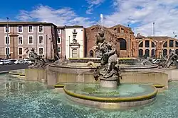 The fountain in this square was originally the fountain of the Acqua Pia (connected to the aqua Marcia aqueduct), commissioned this site by Pope Pius IX in 1870. Completed in 1888, it originally showed four plaster lions designed by Alessandro Guerrieri. These were then replaced in 1901 with sculptures of Naiads by Mario Rutelli[3] from Palermo, the great-grandfather of the politician and former mayor of Rome, Francesco Rutelli.[4]