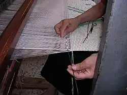 The pibiones or grain weaving technique is most commonly found in the central and eastern areas of Sardinia, Italy.[1] This is a particular type of stitched relief, where the pattern is formed from the countless grains incorporated into the cloth during weaving. These are made by twisting the weft yarn around a needle which is arranged in a horizontal position on the loom; after the thread is beat into place, the needle is then pulled away, leaving behind a raised effect (grains).[2]