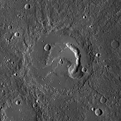 Picasso is a crater on Mercury. It has drawn scientific attention because of the large, arc-shaped pit crater located on the eastern side of its floor. Similar pits have been discovered on the floors of several other Mercury craters, such as Beckett, Glinka, and Gibran. These pits are postulated to have formed when subsurface magma subsided or drained, causing the surface to collapse into the resulting void. If this interpretation is correct, pit-floor craters such as Picasso provide evidence of shallow magmatic activity in Mercury's history.[1][2]