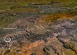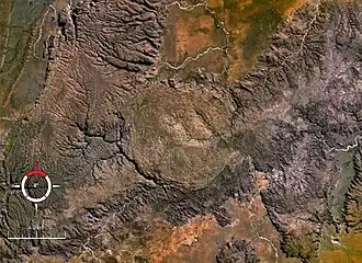 The site is marked by a circular topographic feature on top of the flat-topped sandstone and conglomerate Bungle Bungle Range, clearly visible on remotely sensed images.[2] When first reported in 1983 after aerial observation, it was interpreted as either an impact structure or a cryptovolcanic feature.[3] Later ground examination by E.M. and C.S. Shoemaker confirmed the presence of types of deformation confirming an impact origin.[4]