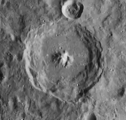 The crater rim has not been severely worn by crater impacts, and the inner wall possesses wide terraces. These structures have been somewhat smoothed by landslips and erosion, most likely induced by seismic activity. An influx of material has entered across the northern rim, flowing down toward the base. The crater floor is relatively smooth, with only minor hills and impact craters. In the middle is a complex central peak surrounded by lesser mounts. The main peak rises to a height of 2.0 kilometers above the surrounding floor.[4][5]