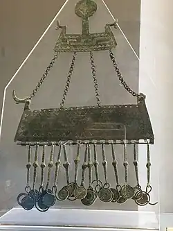 The archaeological evidence bears witness to a diffusion of the Picene civilisation towards the north, up to the northern part of the Marche, where the very rich necropolis of Novilara was found, up to now the only one fully excavated and which has been able to enjoy a complete publication of the results of the excavation. The phase is characterised by a great development of metallurgy, also testified by typical Picene objects, such as the spiral armlets in laminate and the solar boat pectorals with wild duck protomes on the bow and stern, rich in symbolic meanings. In this phase, among other things, the first iron objects appear: short swords and cutlass. Despite this, bronze swords of the "antenna" type are still produced and used. Some metal objects bear witness to relations with the opposite Adriatic shore; among these the fibulae with spectacles, subsequently accompanied by a vast range of typologies of fibulae of all sizes, which appear as a characterising element of Picene female ornaments.[21]