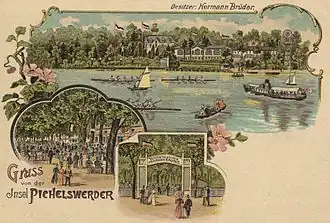 Prior to its incorporation into Greater Berlin in 1920, Pichelswerder was an independent estate district in the district of Osthavelland. According to the 1910 census, the estate district had 39 inhabitants.[3] Although plans were made for a Pichelswerder National Park in the 1910s[4] and a Reichsehrenmal Pichelswerder in the 1920s,[5] both were never realized. Additionally, the buildings for a World's Fair planned by the National Socialists for 1950 on the site were never built.