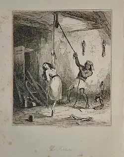 The punishment required placing a wooden peg (of the sort used for tents or for a line for cavalry horses; "picket" etc. were originally alternative names for such pegs) in the ground with the exposed end facing upward. The malefactor was typically a private soldier who had disobeyed orders. One wrist was suspended from a tree by a rope, while the sole or heel of the opposite bare foot was balanced on top of the peg, a piece of wood about four inches long by two inches wide and rounded at the top to about half an inch to meet the legal requirements. The top of the peg was narrow enough to cause considerable discomfort, but not sharp enough to draw blood.[2] To relieve pressure upon a foot, the prisoner relegated all his weight to the wrist, which could only be relieved by shifting weight back onto the foot.