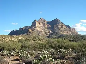 Picketpost Mountain is located just outside the town of Superior, Arizona approximately 40 miles (64 km) east of the Phoenix Metro Area. The summit stands at an elevation of 4,375 feet (1,133 meters) above sea level, with a prominence 2000 feet above its base.[3] The mountain is located in the southern desert region of Tonto National Forest near, but not within the Superstition Mountains,[4] and is popular with hikers. The mountain is known for an oddly placed mailbox at the top of the mountain, which contains the log books for the Picketpost Mountain Trail.