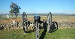 Meanwhile, on the far right end of the Union line, a seven-hour battle raged for the control of Culp's Hill. Lee's intent was to synchronize his offensive across the battlefield, keeping Meade from concentrating his numerically superior force, but the assaults were poorly coordinated and Maj. Gen. Edward "Allegheny" Johnson's attacks against Culp's Hill petered out just as Longstreet's cannonade began.[15] Meade knew another attack was imminent and sent a note to all his subordinates to scrape all stragglers and idle units and put them on the line.[16]