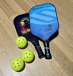 ![]() Pickleball balls and paddles | |