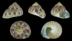 The shell grows to a length of 10 mm. The small, conical shell is imperforate, and rather solid but thin. It is pale olive or yellowish, with a broad spiral band of alternating crimson and white or greenish square blotches below the suture and another just above the periphery. The space between them occupied by several spiral bands of white or greenish, broken into squares by short vertical red lines, the base radiately marked with red lines. The spire is conical. The apex is acute, olive-colored when eroded through the white layer. The sutures are impressed. The spire contains five whorls, the last one flattened beneath. They are smooth except on the base, where fine concentric lines are visible under a lens. The aperture is oblique. The lip is thin, acute, brilliantly iridescent within with green predominating. The thin columella is arcuate, obviously toothed near its junction with the axis above, and covering the place of the umbilicus with a white pad of callus. The base of the shell is concave around the axis.[2]