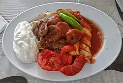 The dish consists of köfte topped with hot tomato sauce over pieces of pita bread and generously slathered with melted sheep's milk butter and yogurt. Tomato sauce and melted butter are generally poured over the dish, at the table.[1][2][3]