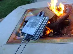 Campfire versions are still made of cast iron and can be cooked over coals, open flames, or a stove, but lightweight aluminium stove-top versions are made, generally being coated with a non-stick surface (PTFE) both as a cleaning aid and to allay fears regarding aluminium in the diet. Once the device is hot, the sandwich can be assembled "inside-out", where the buttered side of the bread faces outwards against the metal plates and the filling sits inside. This produces a crunchier sandwich and helps prevent the bread from sticking.[2] Alternatively, bread can be placed inside unbuttered, which produces a chewier sandwich.[2]