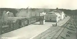 Completing the perpendicular track meant a rise of importance for the Pieksämäki station, and it soon got its own restaurant. The proximity of the railroad had also resulted in another habitation centre near the station, and in the 1920s, it outgrew the old Tienristi, thus becoming the centre of the area. The separate Pieksämäki village became a market town called Pieksämä in 1930, but the Finnish Railway Institute did not rename the station. Later, the city council changed its mind, and Pieksämä was renamed back to Pieksämäki in 1948.[3] During World War II, the important crossing point station was the target of many bombings, and the station restaurant also burned down.[4] Nevertheless, traffic increased both during and after the war. This was partly because of a track between Varkaus and Joensuu, built in 1940.
