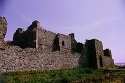 Being separated from neighbouring Roa Island by the Piel Channel, the island is accessible via a ferryboat from Roa Island pier during summer and subject to the tides and weather. Piel can be reached on foot or by off-road vehicle (licenses are required to drive on the sands) from Walney Island, but this route is only passable with care at low tide; local guidance is recommended.[10] Piel Castle is managed by English Heritage and there is free, unlimited access once on the island. The castle, located on the southeast tip of Piel Island, is an impressive ruin made up largely of stones from the beach. The three-storey keep affords good views of the island although it is no longer accessible to visitors. Campers may pitch a tent on the island.[2]