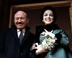 Angeli left Dean and married singer and actor Vic Damone in 1954.[11] Singer and actor Dean Martin performed at their wedding.[1] It was reported by several people who attended the wedding that they saw James Dean, claiming Dean watched the wedding from across the road on his motorcycle, even gunning the engine during the ceremony, although Dean later denied doing anything so "dumb."[9][12]