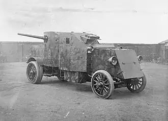 The Pierce-Arrow armoured lorry was a turreted armoured lorry based on an imported American Pierce-Arrow Motor Car Company 5-ton truck chassis with added armoured bodywork, it was armed with a turreted QF 3-pounder Vickers gun.[1][2][3] The Pierce-Arrow had a front mounted engine protected by folding armoured panels, behind the engine was an enclosed driver's compartment a single two armoured shutter, the turret was behind the driver's compartment.[1] The Pierce-Arrow armoured lorry used the same chassis as the Pierce-Arrow armoured AA lorry, it used identical bonnet armour as the latter whilst the driver's compartment was reduced to half width to allow the main gun to fire forwards.[3]