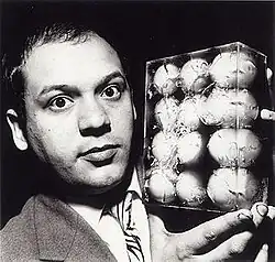 Manzoni founded the Azimut Gallery in Milan in 1959 with the artist Enrico Castellani, and staged a series of revolutionary exhibitions of multiples. The first, 12 Linee (12 Lines) took place in December 1959, quickly followed by Corpi d'Aria (Bodies of Air) in May 1960.[13] This was an edition of 45 balloons on tripods that could be blown up by the buyer, or the artist himself, depending on the price paid. In July 1960, he exhibited Consumption of Art by the Art-Devouring Public, in which he hard-boiled 70 eggs, printed his thumbprint onto them, and after eating several himself handed them out to the audience to eat. The eggs themselves were titled Uova con impronta (Egg With Thumbprint). This was the last exhibition by Manzoni at Azimuth, after which the gallery was forced to close when the lease ran out. Although the invitation named the Gallery Azimut as the location of the opening, the actual event took place at the Studio Filmgiornale Sedi in Milan. The discrepancy between the location on the invitation and the film studio where the event was recorded further complicates the role and space of art as it was expected to be seen.[5]