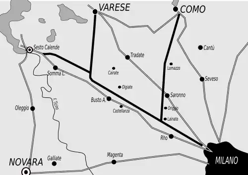 In the period following the First World War, after economic development recommenced in Italy, a project to build a motorway was conceived - that is "... a new road reserved exclusively for motor traffic ... ". In 1922 Puricelli designed the project, connecting Milan to Lake Como and Lake Maggiore.[3] On 20 September 1923, King Vittorio Emanuele III inaugurated the first section of the motorway, to Gallarate. For its time, this was a futuristic work: the cart and the bicycle were still the dominant means of personal transport in Italy at the time, and there were no more than 85,000 motor vehicles in Italy in 1924, half in Lombardy.
